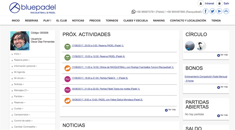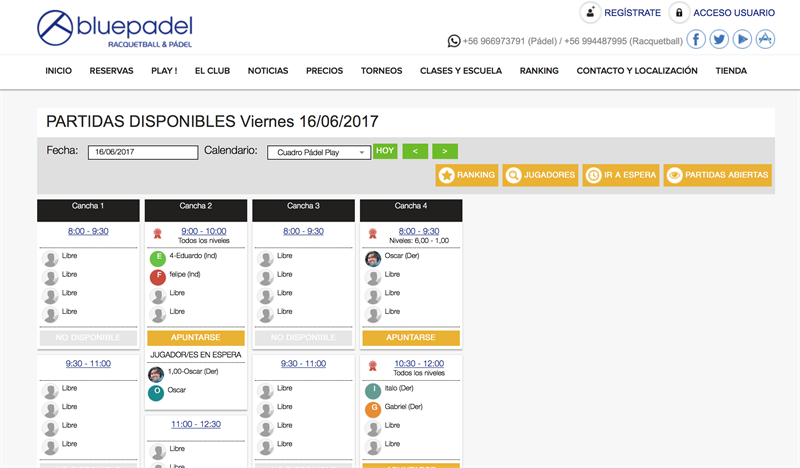 Bluepadel, Centro deportivo de Padel y Racquetaball, siempre innovando y mejorando en todos los aspectos de servicio y atención a sus clientes, tiene el agrado de comunicarte que desde el día lunes 29 de junio de 2017 tenemos a  tu disposición un nuevo sistema de gestión deportiva de Pádel y Racquetball.  Bienvenidos y los invitamos a usar y disfrutar nuestro nuevo sistema.  Te estaremos informando, por todas nuestras redes sociales y por nuestro NewsLetter,  de cómo usar todas las funciones, en particular PLAY la cual te permitirá armar tus propios partidos con tus amigos u otros partners de tu nivel. Fundamental para el buen funcionamiento de PLAY es que pongas tu nivel o categoria en tu perfil personal, tu disponibilidad, la cual debes actualizar regularmente de modo que el sistema te envie información cuando realmente estas disponible para jugar y eres de la categoria del partido que esta en proceso de armado.